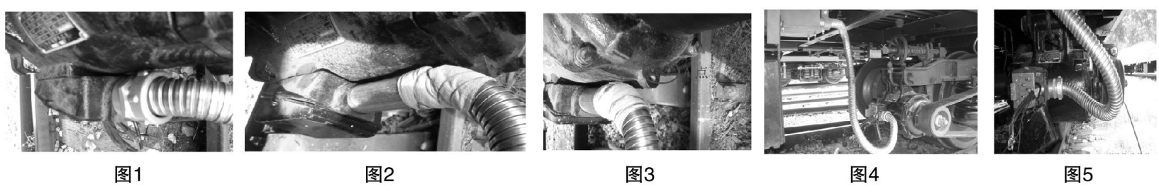 制作一段60mm長(zhǎng)的全牙的外絲,將其兩端分別與接線盒和螺接式金屬軟管接頭進(jìn)行連接。考慮到接線盒與電機(jī)外殼空間狹窄,接頭無(wú)法旋轉(zhuǎn)緊固,決定將電機(jī)接線盒的緊固螺栓松開(kāi),接線盒會(huì)略向外遠(yuǎn)離電機(jī)外殼一些,這樣就給出了足夠金屬軟管接頭旋轉(zhuǎn)的空間。將軟管接頭旋緊后,保證其凸起處不朝向電機(jī)外殼則不會(huì)發(fā)生干涉,再將接線盒重新進(jìn)行緊固即可。由于省去了鍍鋅管的長(zhǎng)度,金屬軟管折彎處不再存在超出限界的可能性。至此線束防護(hù)完全復(fù)合工藝要求,該問(wèn)題得到了徹底解決(如圖5)。